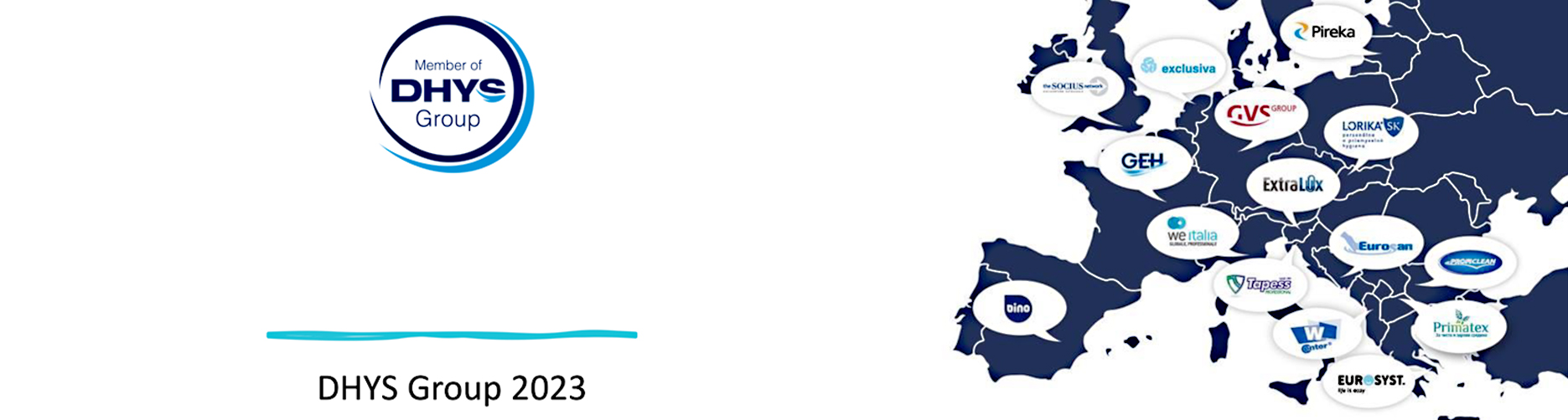 Nous sommes membres du Groupe DHYS (D pour Distribution, HY pour Hygiène et S pour Spécialiste), l’un des leaders internationaux en matière d’hygiène professionnelle. Ce groupement est composé actuellement de douze groupes majeurs européens en matière de distribution : le Groupe GVS (en Allemagne), le Groupe GEH (en France), le Groupe Dino (en Espagne), WE Italia (en Italie), Extralux (en Slovénie), Socius Network (au Royaume-Uni), Eurosan (Bosnie-Herzégovine), Tapess (en Croatie), Exclusiva (au Pays-Bas), Eurosyst (en Grèce), Pireka (en Lituanie) et Proficlean (en Bulgarie), Lorika Slovaki (en Slovaquie), Primatex (Macédoine, Kosovo), W.Center (Albanie, Kosovo) – avec environ 160 entreprises familiales dans 35 pays.